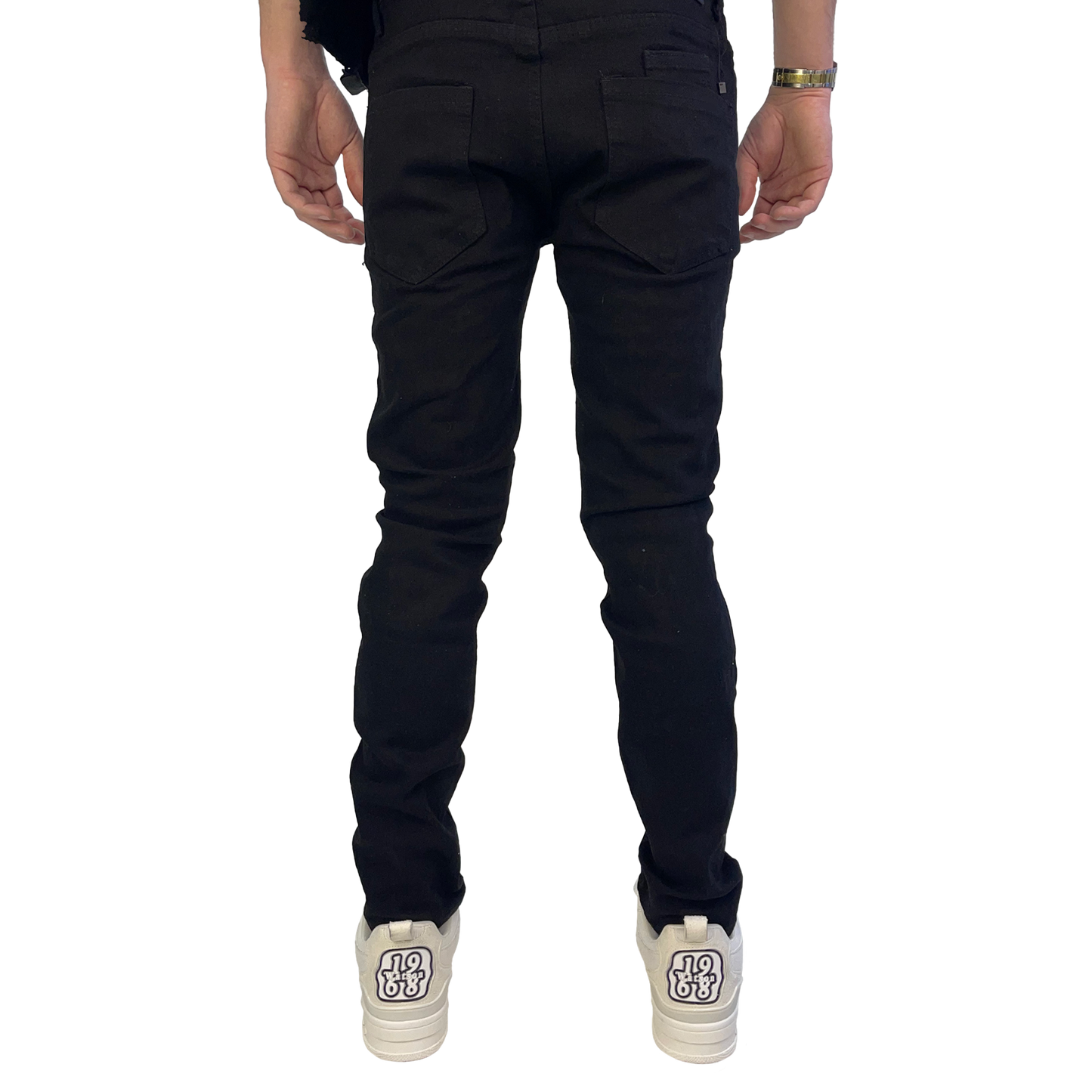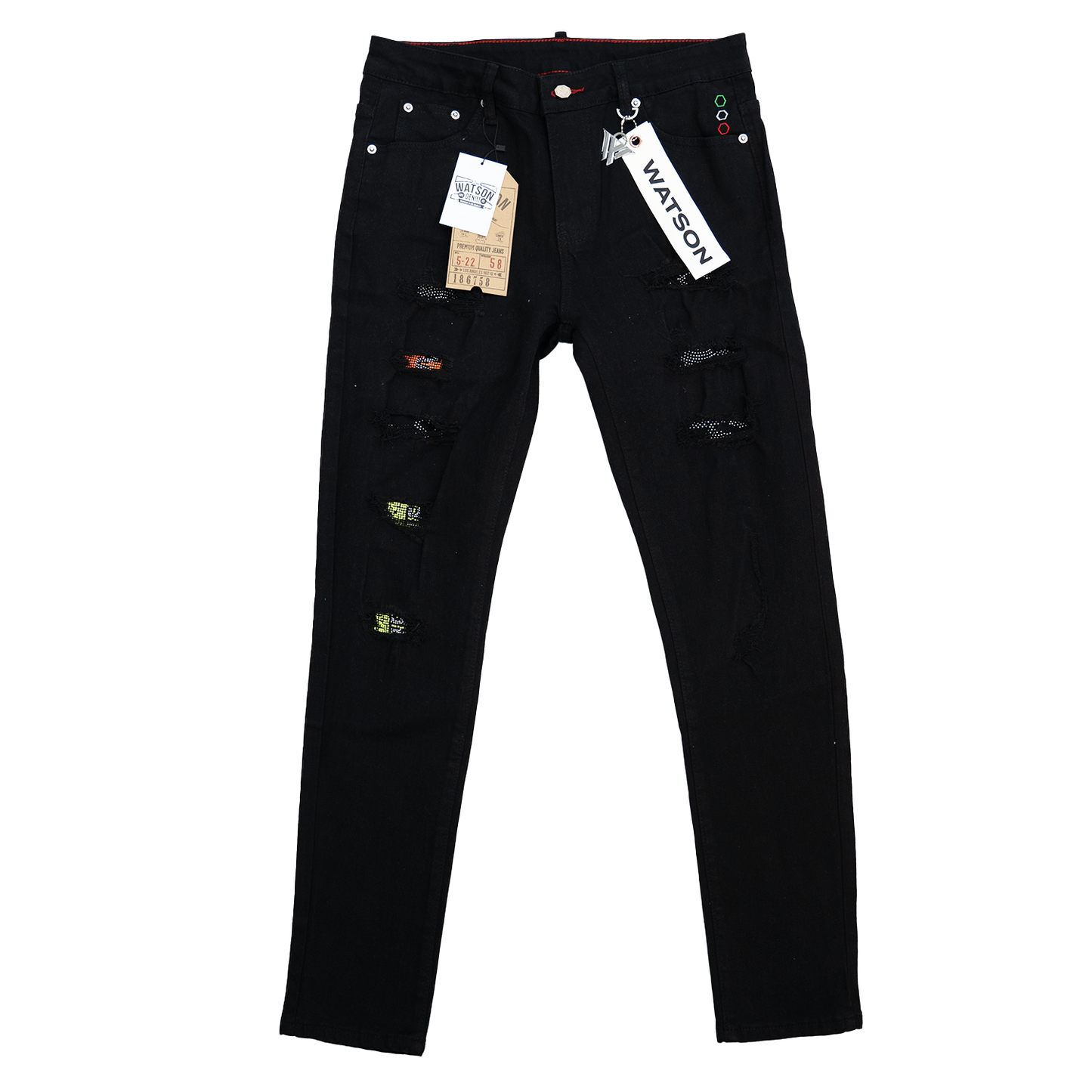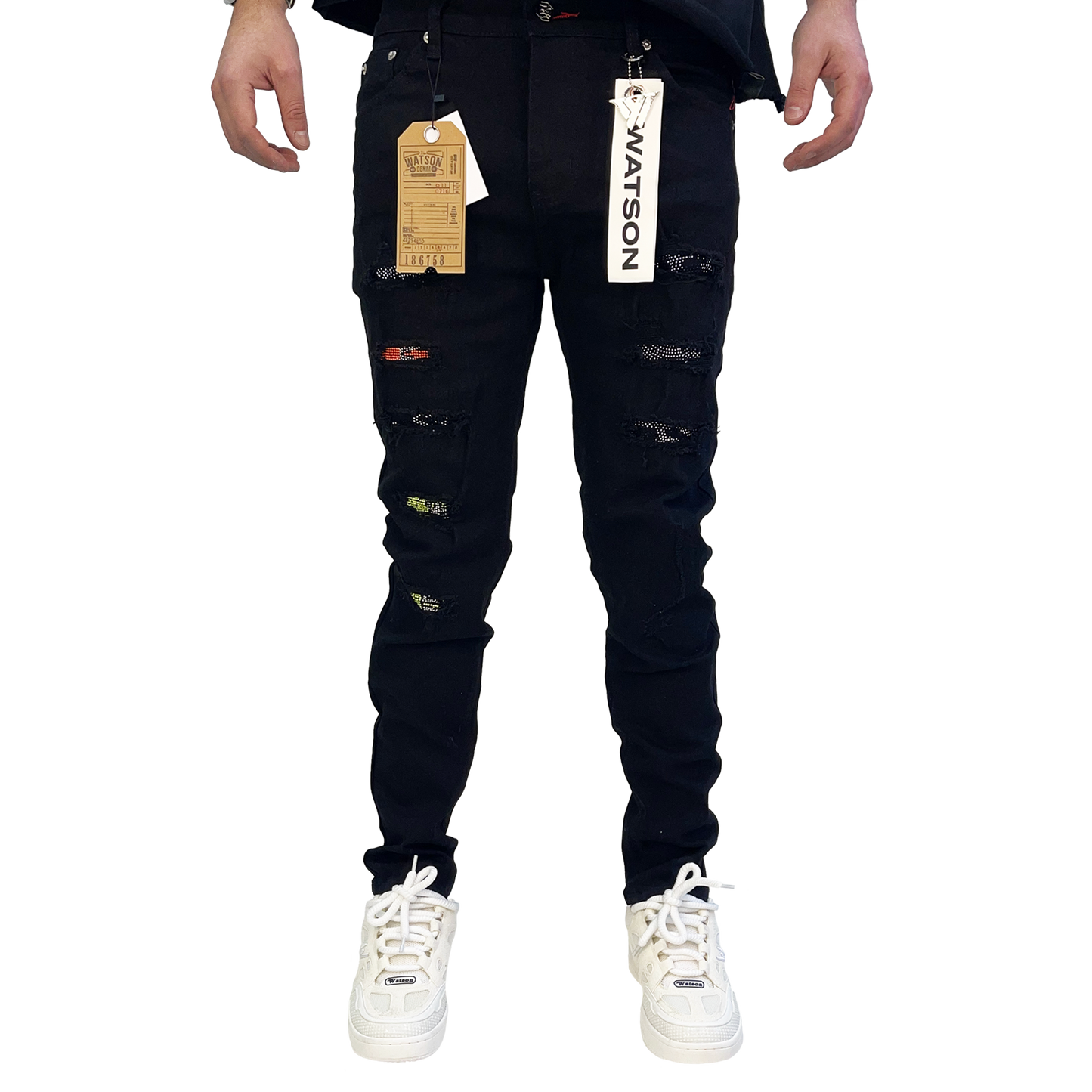 BLACK EMBELLISHED MULTI RIPPED WATSON DENIM